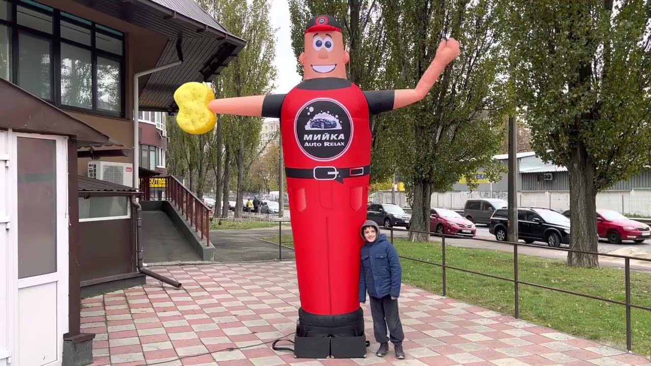 Надувная фигура автомойщика используется для привлечения внимания к автомойке. Высота — 340 см. Яркий красный костюм и движение делают фигуру заметной на расстоянии.